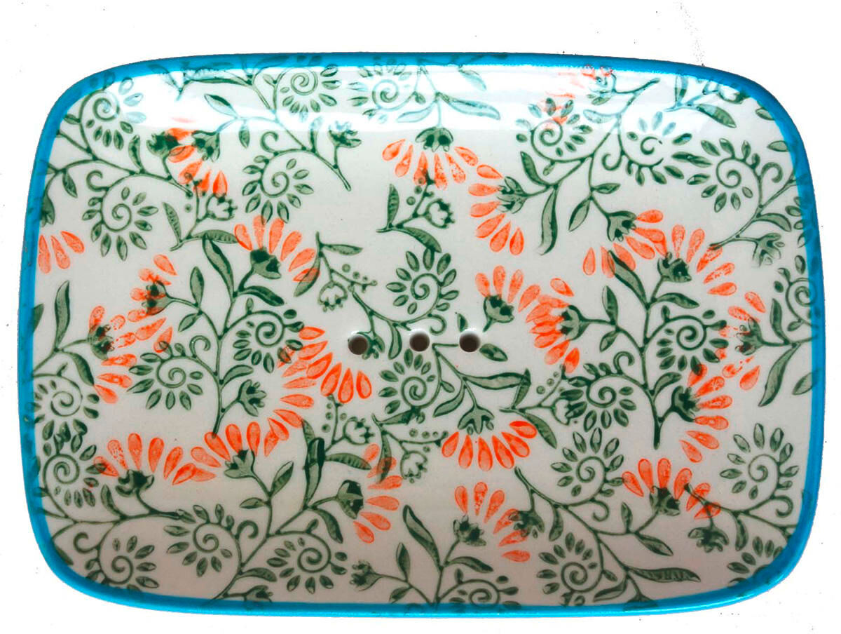 Con la jabonera de gres, su jabón siempre tiene un lugar firme y se mantiene bien seco gracias a los agujeros de drenaje. El motivo floral estampado a mano con un borde azul aporta ese toque especial a su baño.